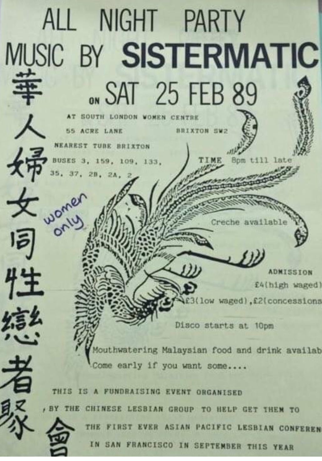 Now back to the flyer. Secondly, I want to draw your attention to - the international solidarity: the party was a fundraiser for the first ever Asian Pacific Lesbian conference in San Francisco. This South London party took an internationalist approach by extending its reach all the way to the United States for international fundraising, breaking through the narrow focus on line ups and DJs that often characterises many gatherings today.